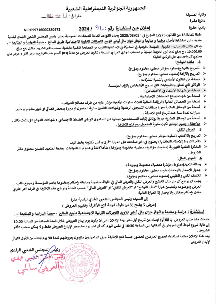استشارة من أجل: دراسة ومتابعة وانجاز خزان مائي أرضي لتزويد التجزئات الترابية الاجتماعية طريق المالح -حصة الدراسة والمتابعة-2 ديسمبر، 20240 5 شاركها فيسبوك X مشاركة عبر البريد طباعة