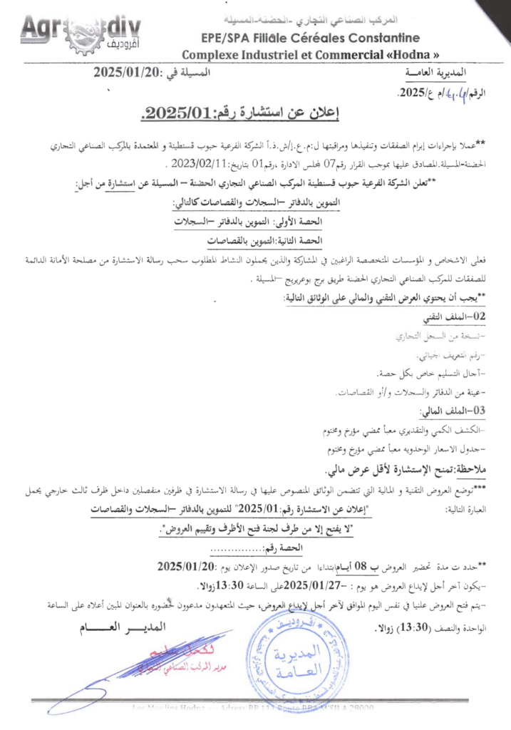 إعلان عن استشارة 2025/01 المركب الصناعي التجاري -الحضنة- المسيلة