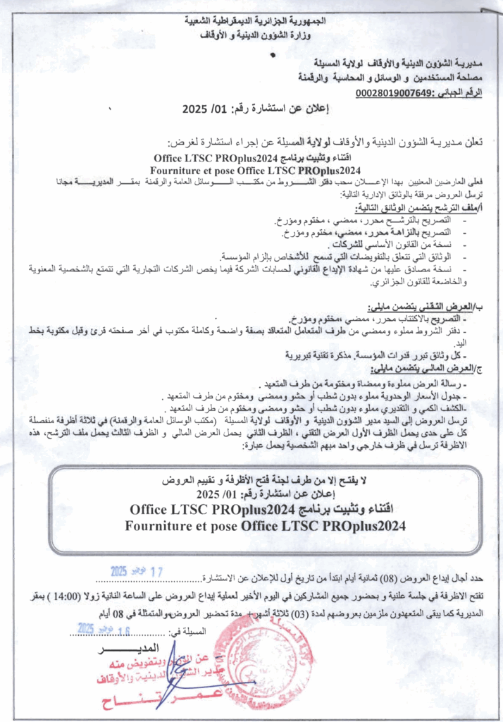 إعلان عن استشارة 2025/01 مديرية الشؤون الدبنية والأوقاف لولاية المسيلة