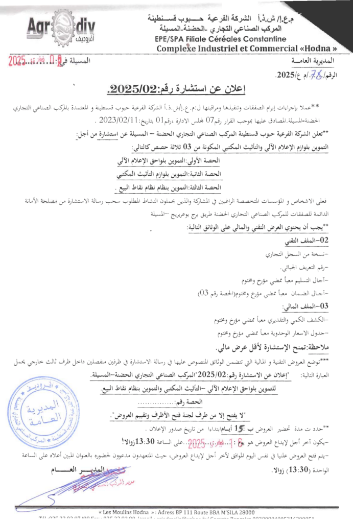 إعلان عن استشارة 2025/02 المركب الصناعي التجاري – الحضنة المسيلة