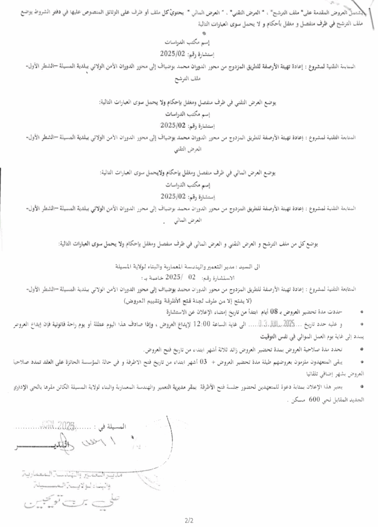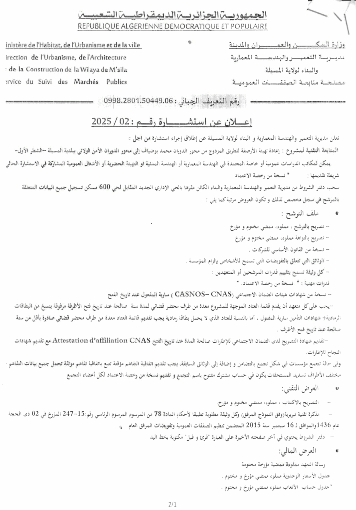 إعلان عن استشارة 2025/02 مديرية التعمير والهندسة المعمارية والبناء لولاية المسيلة