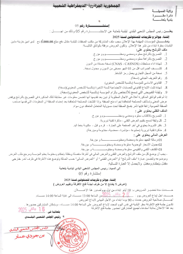 استشارة من أجل: اقتناء جوائز وتكريمات للمتفوقين لسنة 202519 يناير، 20250 20 شاركها فيسبوك X مشاركة عبر البريد طباعة