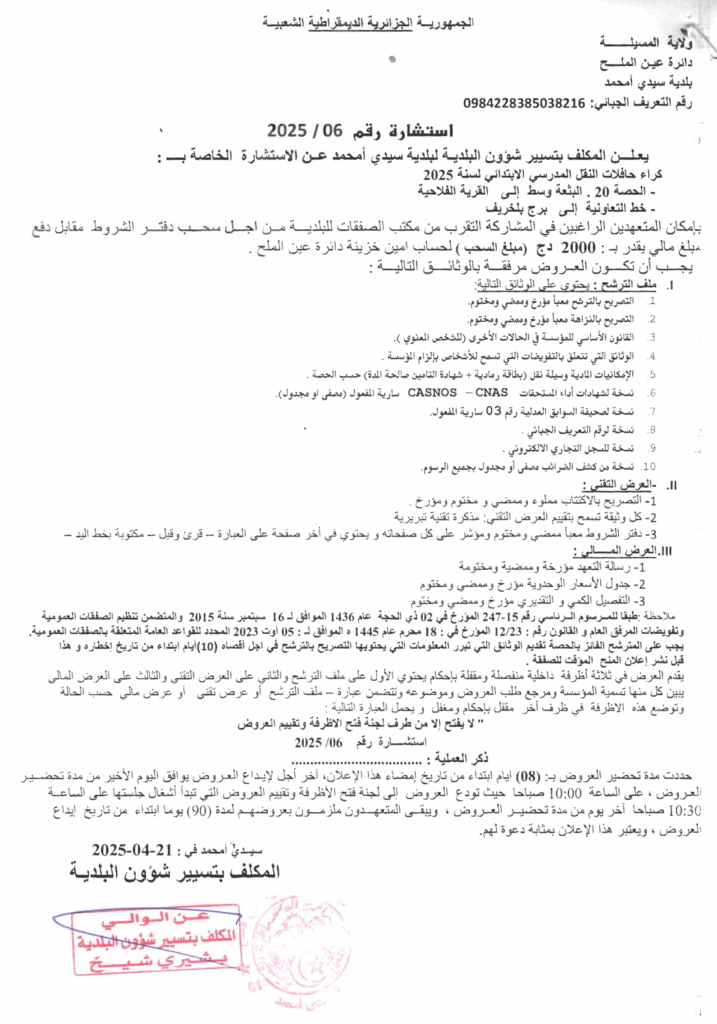 كراء حافلات النقل المدرسي الابتدائي لسنة 202528 أبريل، 20250 6 شاركها فيسبوك X مشاركة عبر البريد طباعة