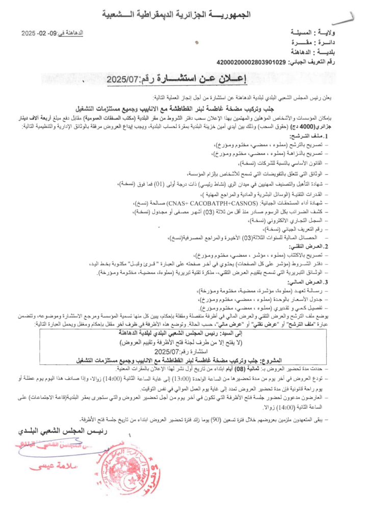 إعلان عن استشارة 2025/07 بلدية الدهاهنة