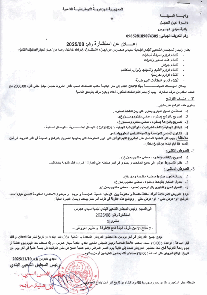 إعلان عن استشارة 2025/08 بلدية سيدي هجرس
