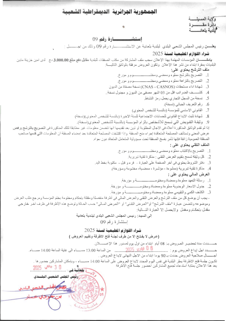 استشارة من أجل: شراء اللوازم المطبعية لسنة 2025 2 فبراير، 20250 3 شاركها فيسبوك X مشاركة عبر البريد طباعة