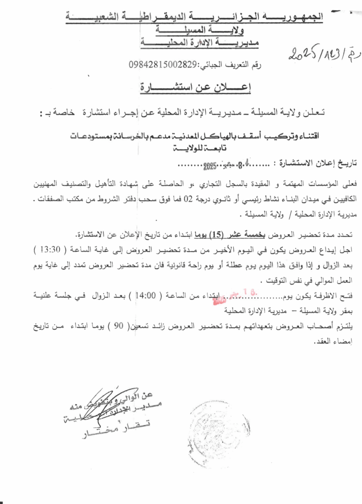 إعلان عن استشارة 2025/123 مديرية الإدارة المحلية لولاية المسيلة
