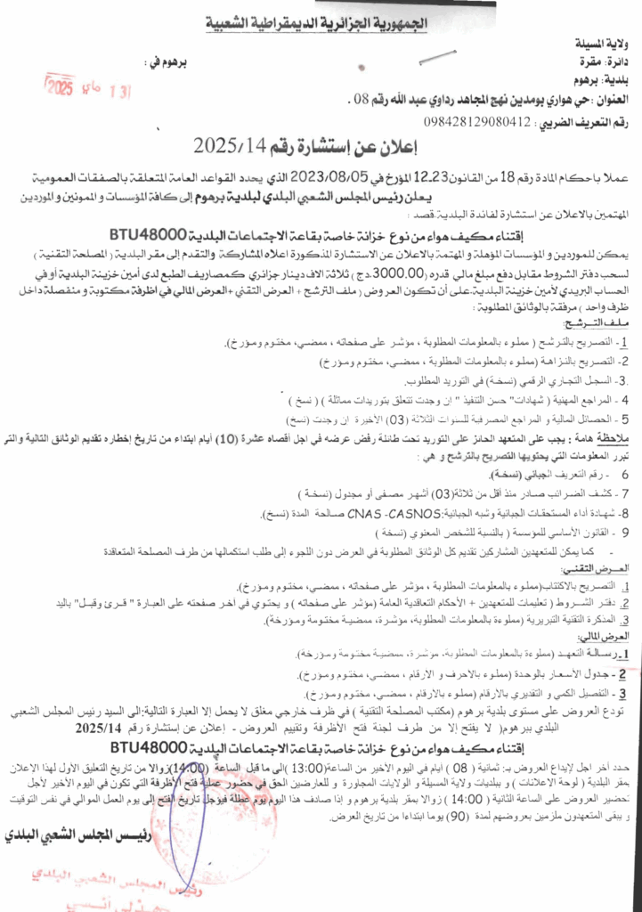 اقتناء مكيف هواء من نوع خزانة خاصة بقاعة الاجتماعات البلدية BTU4800015 مايو، 20250 15 شاركها فيسبوك X مشاركة عبر البريد طباعة