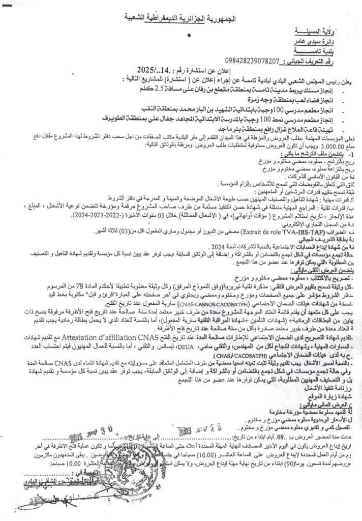إعلان عن استشارة 2025/14 بلدية تامسة