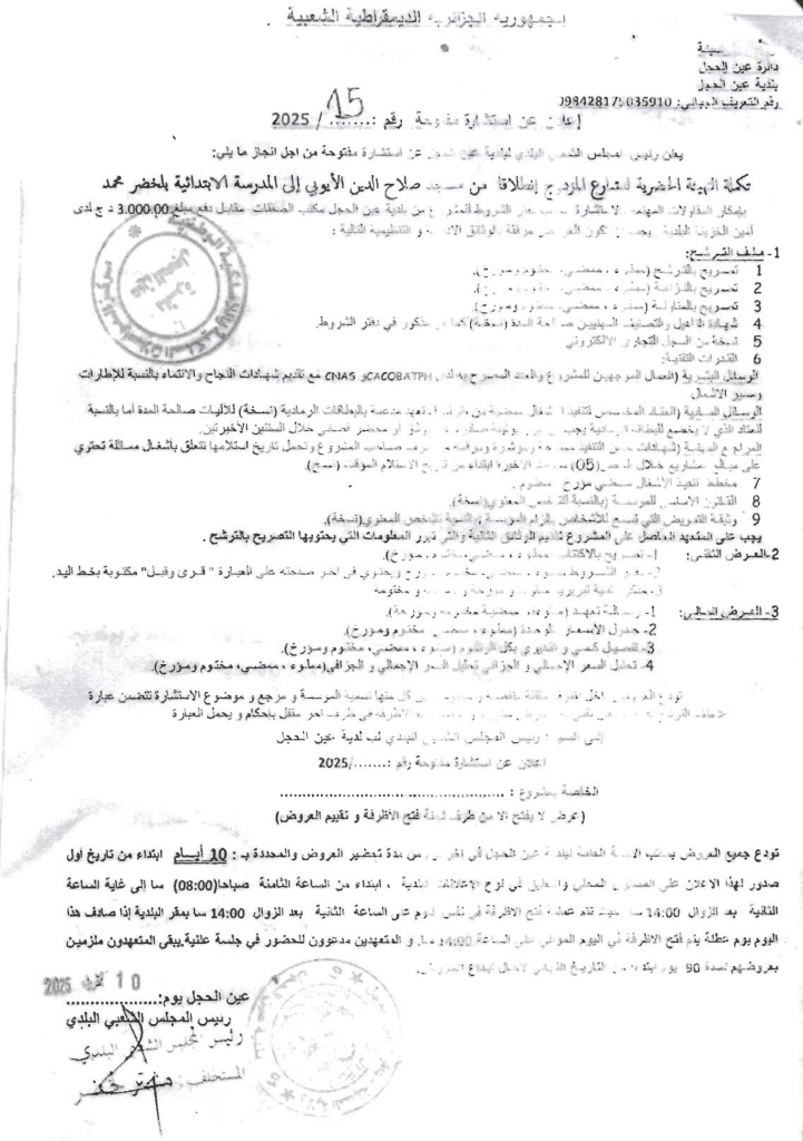 تكملة التهيئة الحضرية للشارع المزدوج من مسجد صلاح الدين الأيوبي إلى المدرسة الابتدائية بلخضر محمد16 أبريل، 20250 11 شاركها فيسبوك X مشاركة عبر البريد طباعة