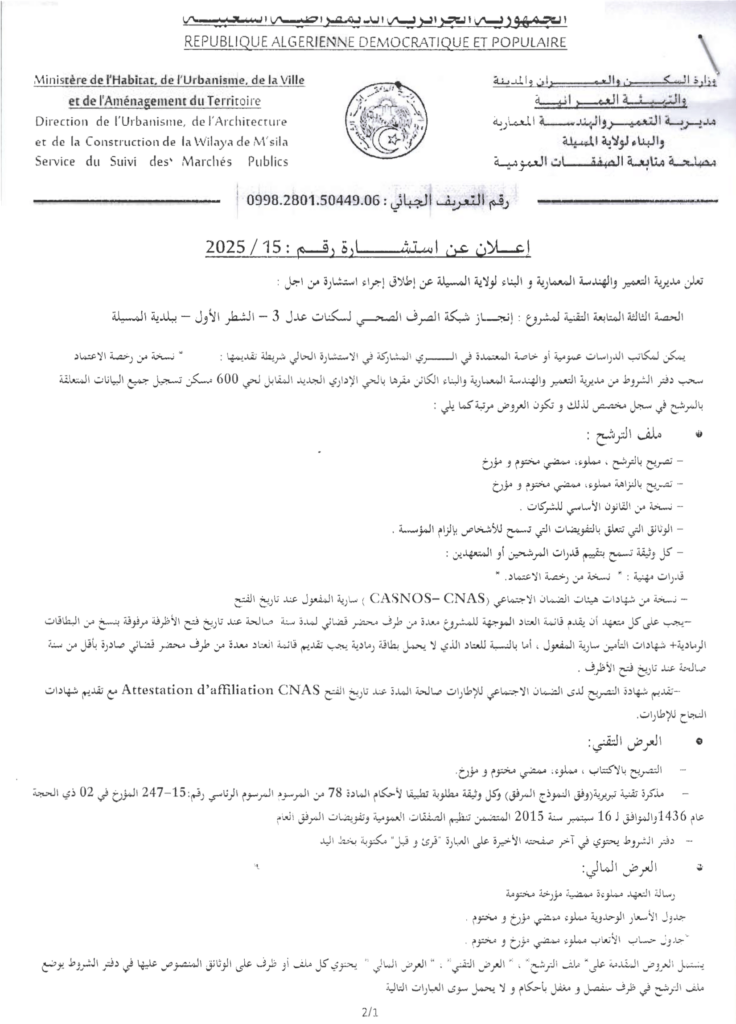 إعلان عن استشارة 2025/15 مديرية التعمير والهندسة المعمارية والبناء لولاية المسيلة