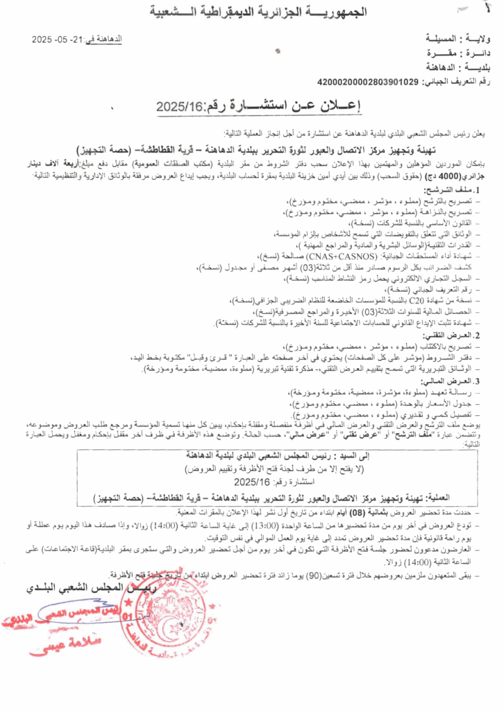 تهيئة وتجهيز مركز الاتصال والعبور لثورة التحرير ببلدية الدهاهنة -قرية القطاطشة- (حصة التجهيز)22 مايو، 20250 18 شاركها فيسبوك X مشاركة عبر البريد طباعة
