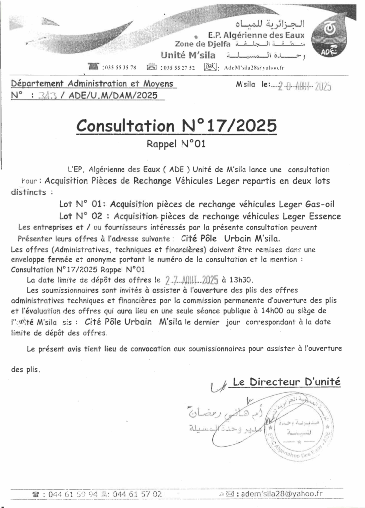 إعلان عن استشارة 2025/17 الجزائرية للمياه وحدة المسيلة