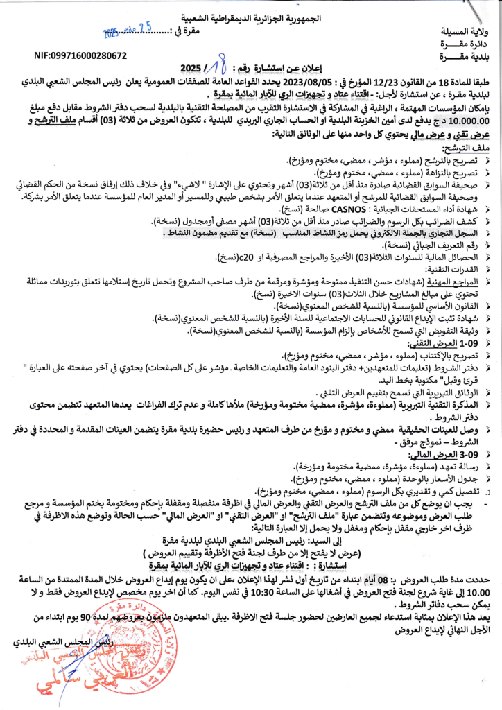 اقتناء عتاد وتجهيزات الري للآبار المائية بمقرة27 مارس، 20250 9 شاركها فيسبوك X مشاركة عبر البريد طباعة