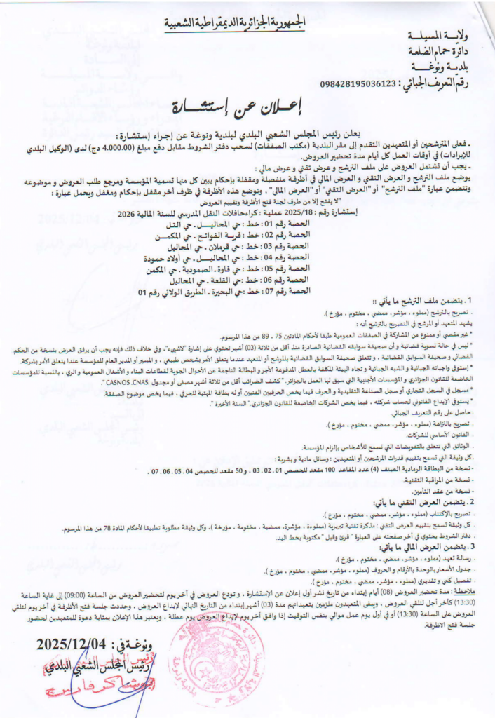 إعلان عن استشارة 2025/18 بلدية ونوغة