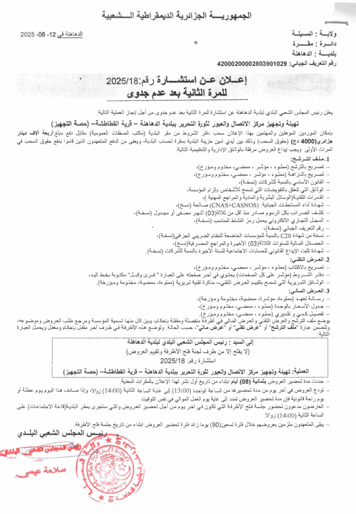 تهيئة وتجهيز مركز الاتصال والعبور لثورة التحرير ببلدية الدهاهنة -قرية القطاطشة-(حصة التجهيز)15 يونيو، 20250 24 شاركها فيسبوك X مشاركة عبر البريد طباعة