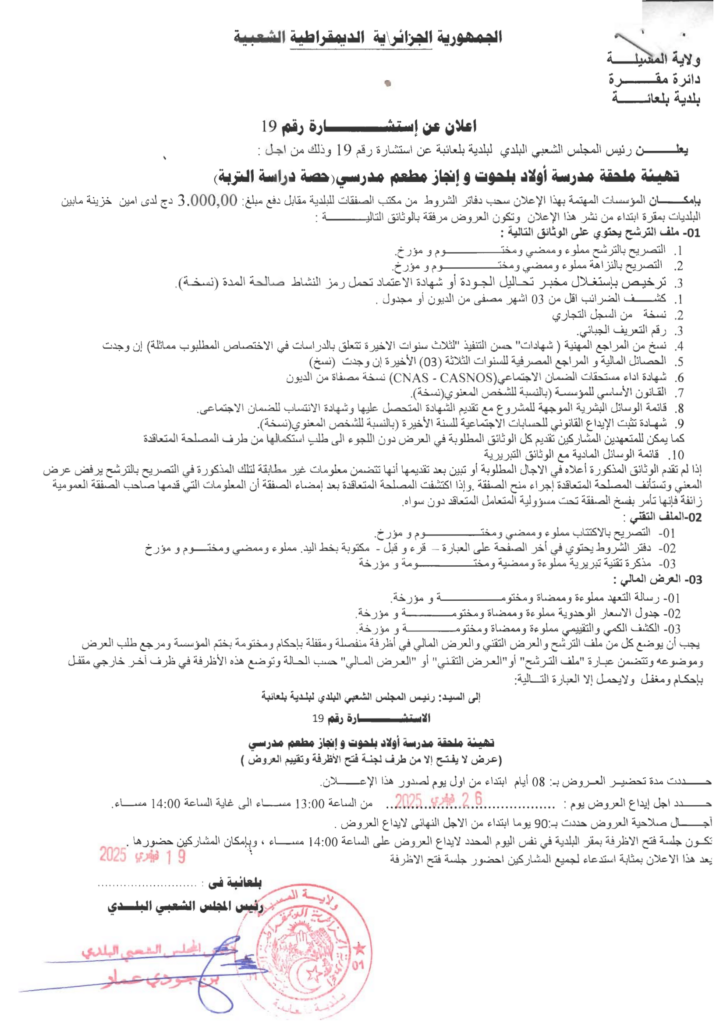استشارة من أجل: تهيئة ملحقة مدرسة أولاد بلحوت وانجاز مطعم مدرسي (حصة دراسة التربة)23 فبراير، 20250 25 شاركها فيسبوك X مشاركة عبر البريد طباعة