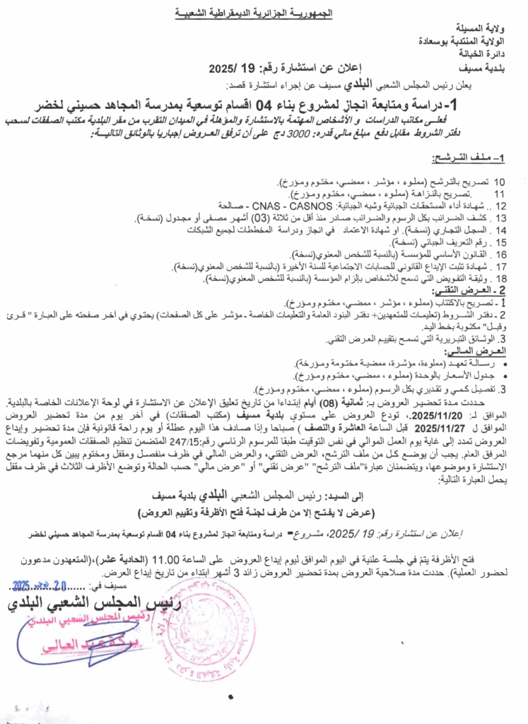 إعلان عن استشارة 2025/19 بلدية مسيف