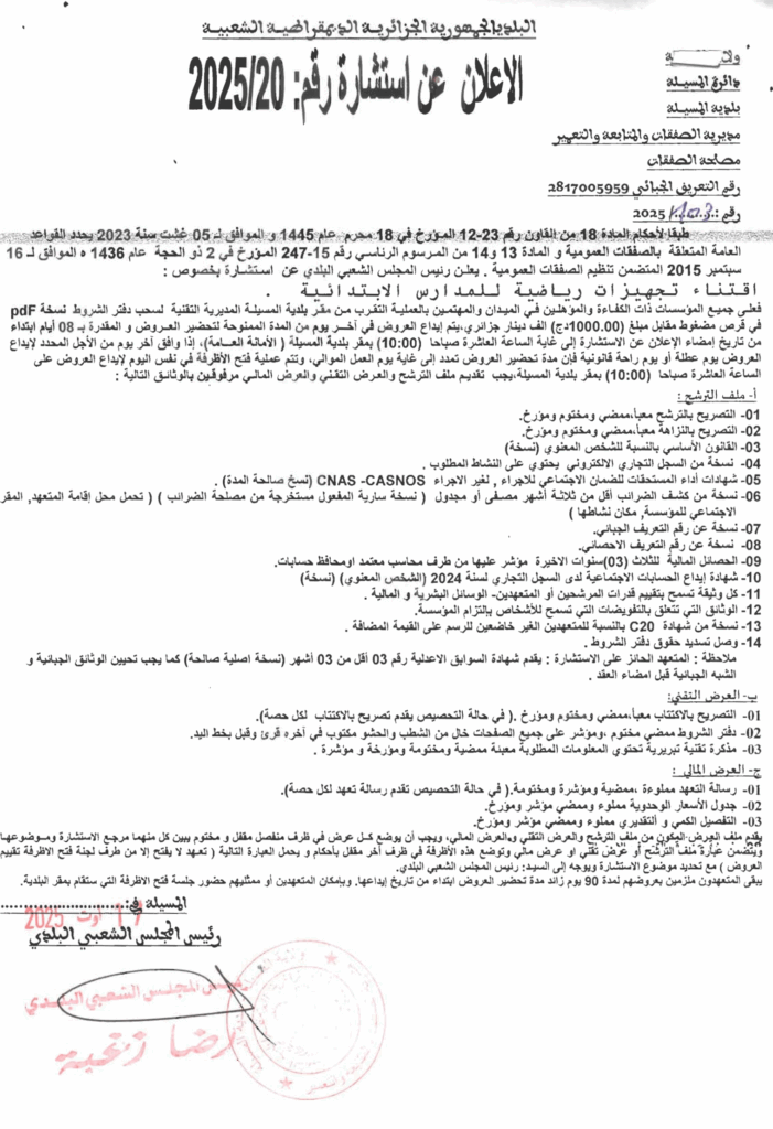 إعلان عن استشارة 2025/20 بلدية المسيلة