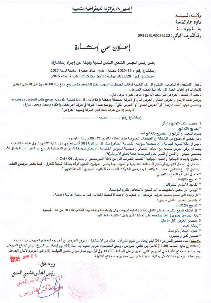 إعلان عن استشارة 2025/20/19 بلدية ونوغة
