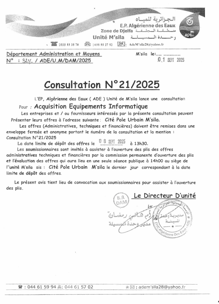 إعلان عن استشارة 2025/21 الجزائرية للمياه وحدة المسيلة
