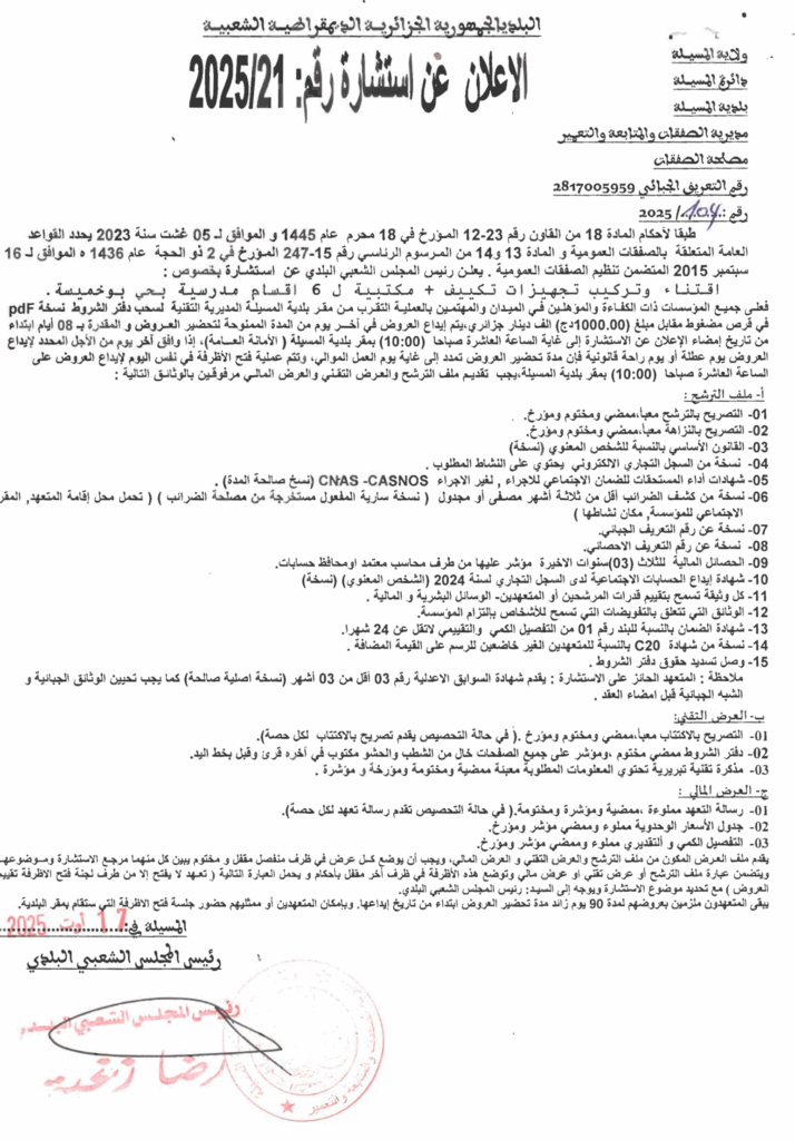 إعلان عن استشارة 2025/21 بلدية المسيلة