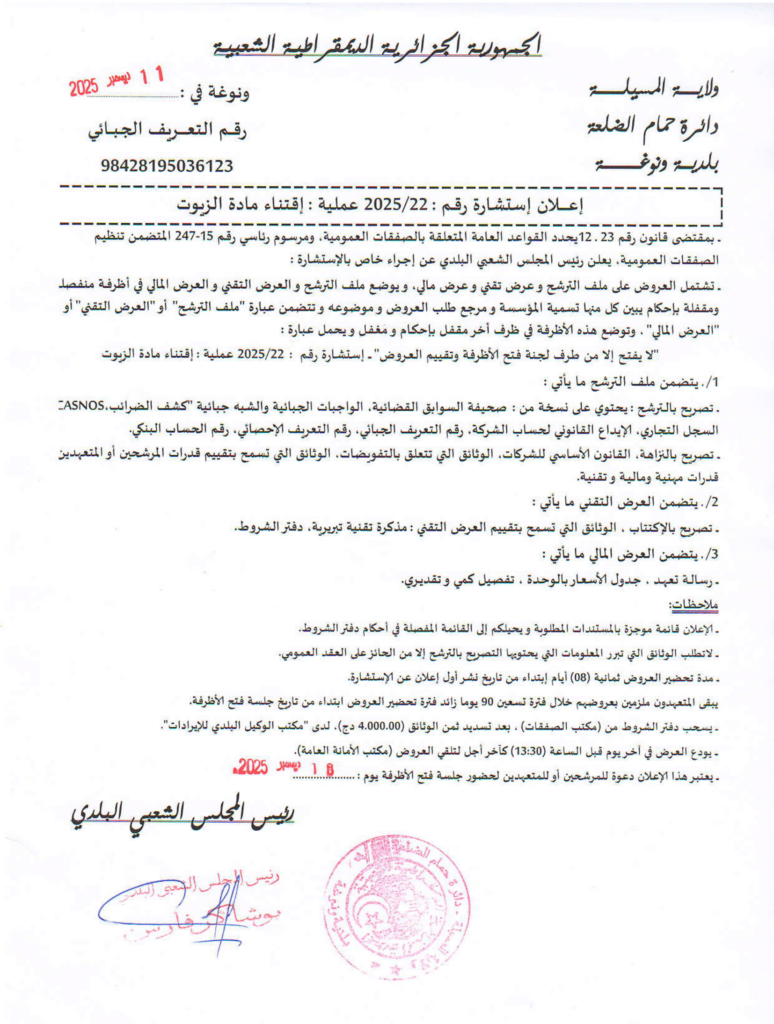 إعلان عن استشارة 2025/22 بلدية ونوغة