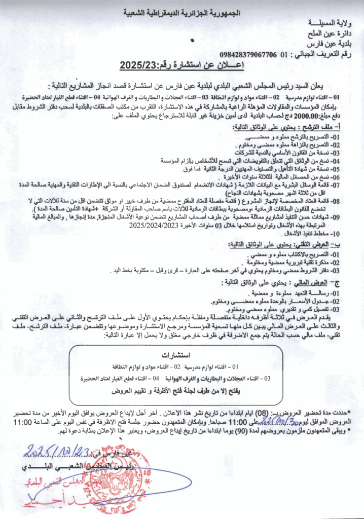إعلان عن استشارة 2025/23 بلدية عين فارس