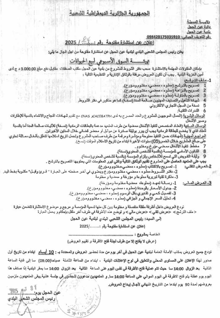 إعلان عن استشارة 2025/24 بلدية عين الحجل