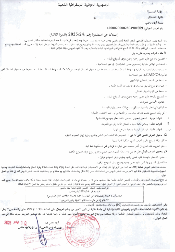 إعلان عن استشارة 2025/24 (للمرة الثانية) بلدية أولاد ماضي