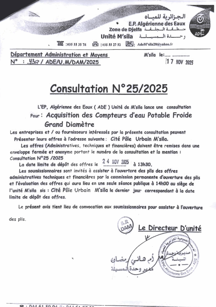 إعلان عن استشارة 2025/25 الجزائرية للمياه وحدة المسيلة