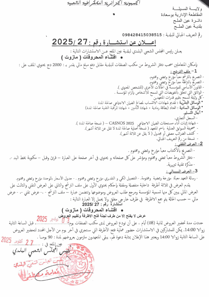إعلان عن استشارة 2025/27 بلدية عين الملح