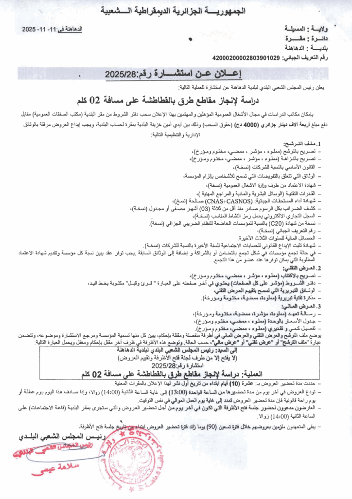 إعلان عن استشارة 2025/28 بلدية الدهاهنة