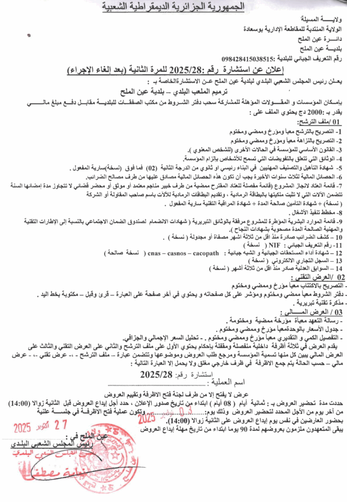 إعلان عن استشارة 2025/28 للمرة الثانية (بعد إلغاء الاجراء)/ بلدية عين الملح