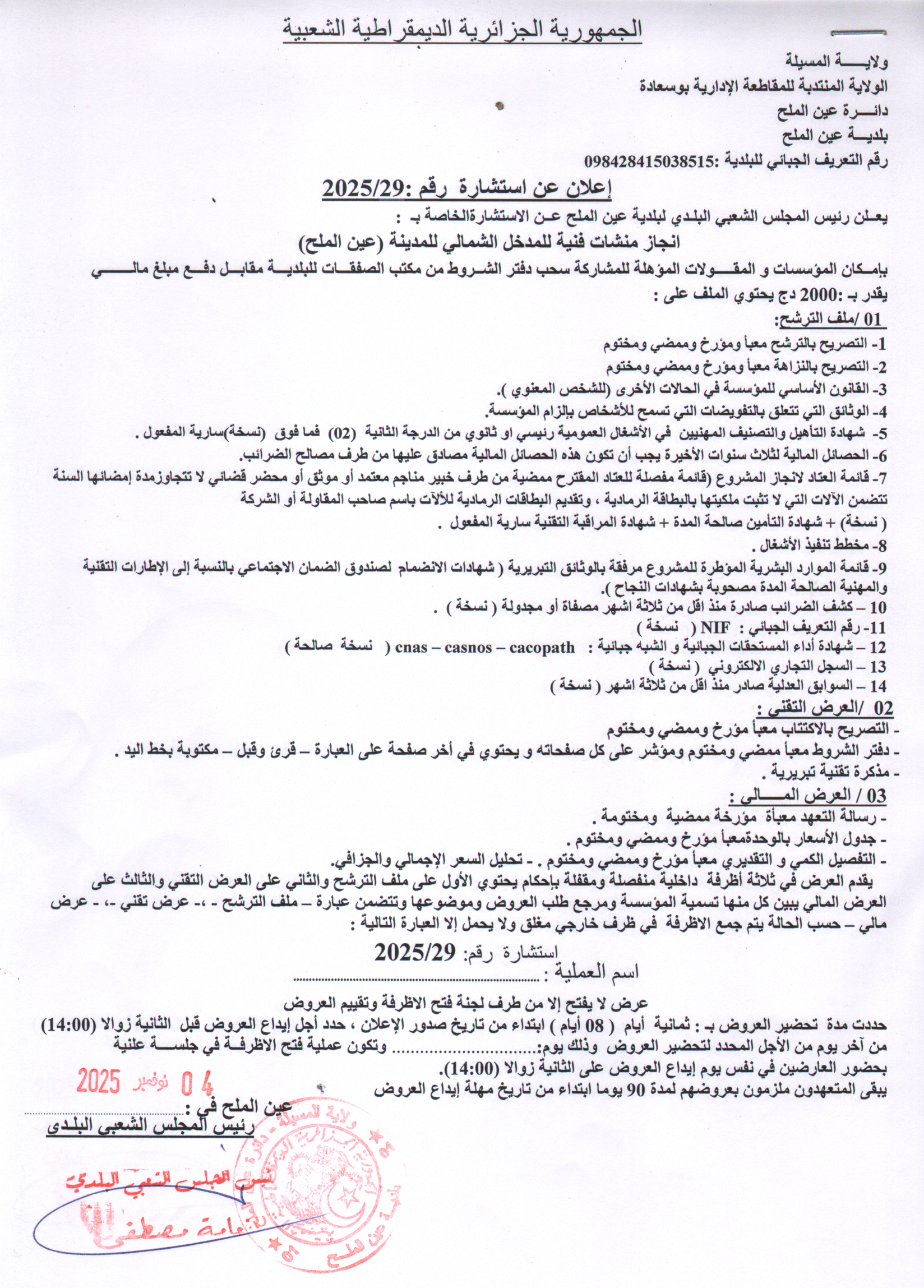 إعلان عن استشارة 2025/29 بلدية عين الملح