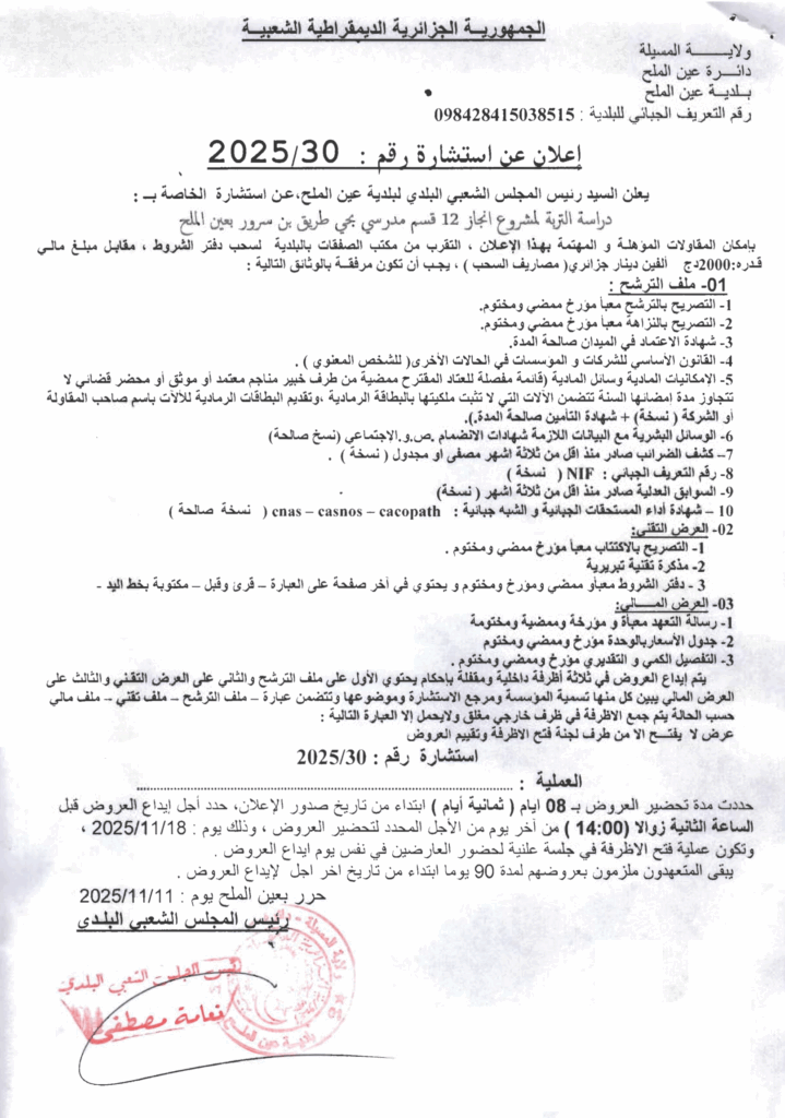 إعلان عن استشارة 2025/30 بلدية عين الملح