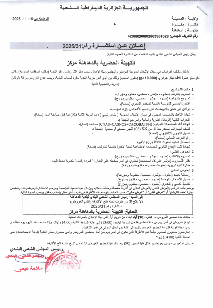 إعلان عن استشارة 2025/31 بلدية الدهاهنة