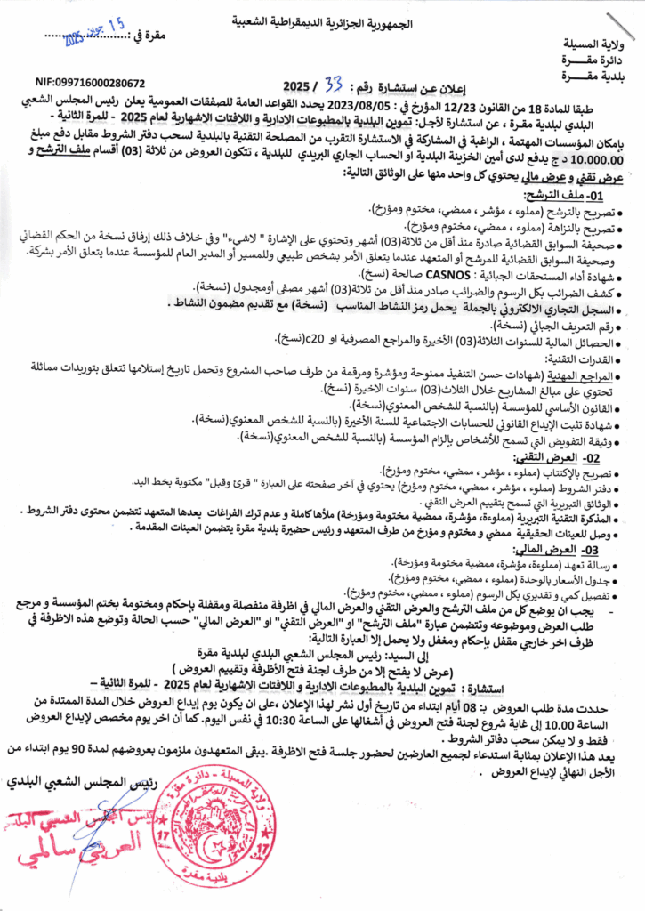 تموين البلدية بالمطبوعات الادارية واللافتات الاشهارية لعام 2025 -للمرة الثانية-15 يونيو، 20250 16 شاركها فيسبوك X مشاركة عبر البريد طباعة