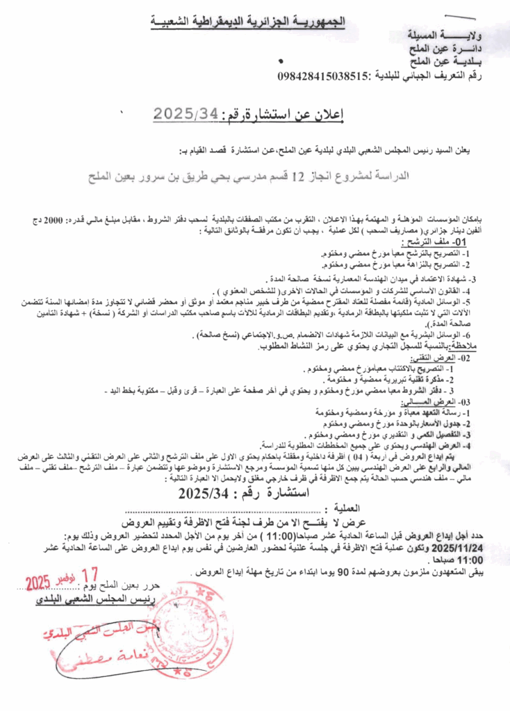 إعلان عن استشارة 2025/34 بلدية عين الملح