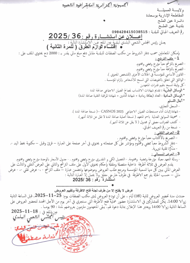 إعلان عن استشارة 2025/36 بلدية عين الملح