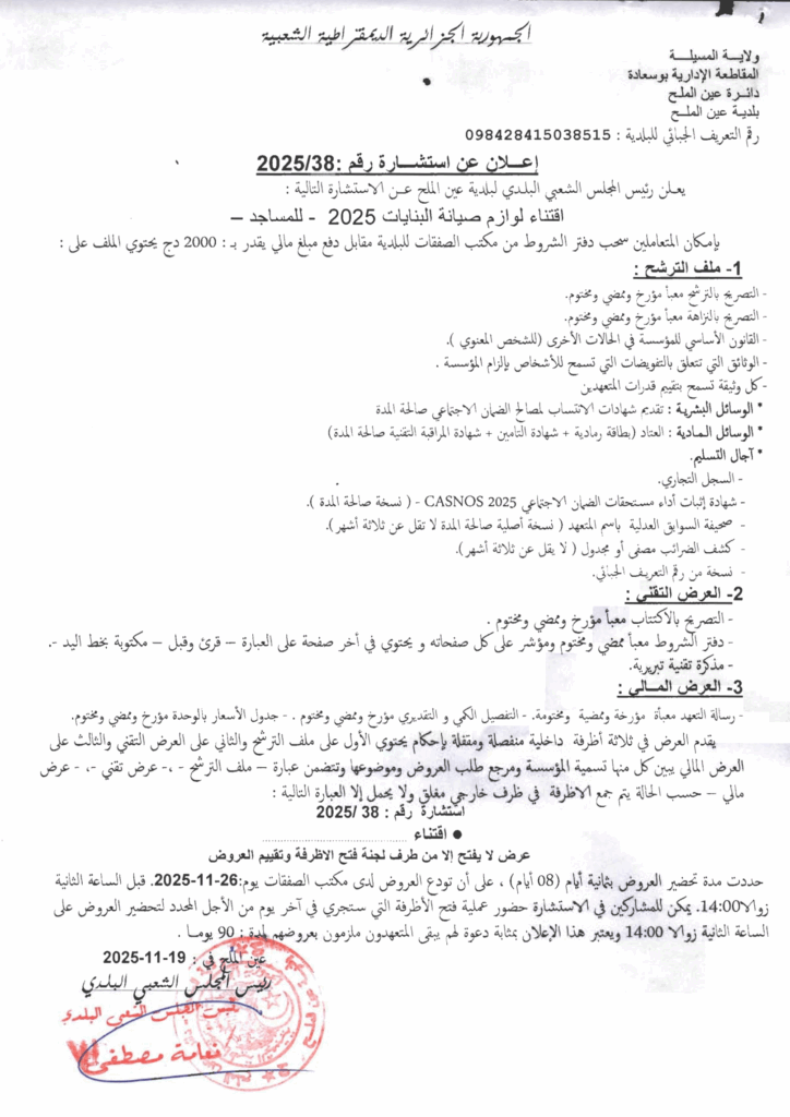 إعلان عن استشارة 2025/38 بلدية عين الملح