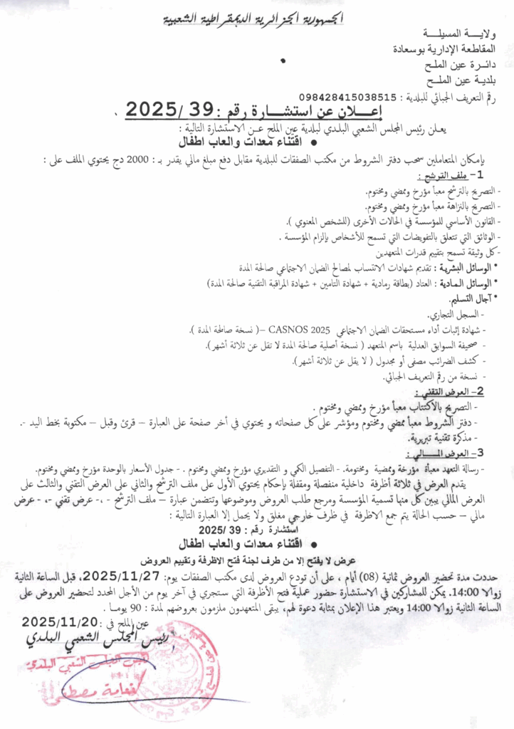 إعلان عن استشارة 2025/39 بلدية عين الملح