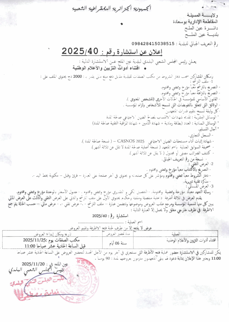 إعلان عن استشارة 2025/40 بلدية عين الملح