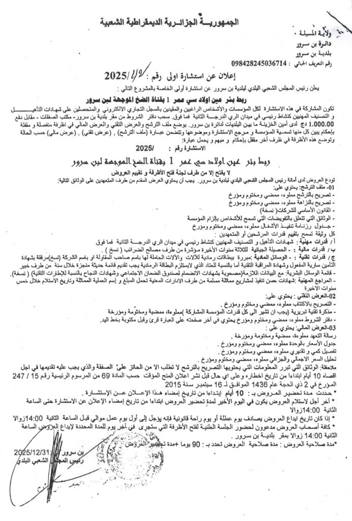 إعلان عن استشارة 2025/42 بلدية بن سرور