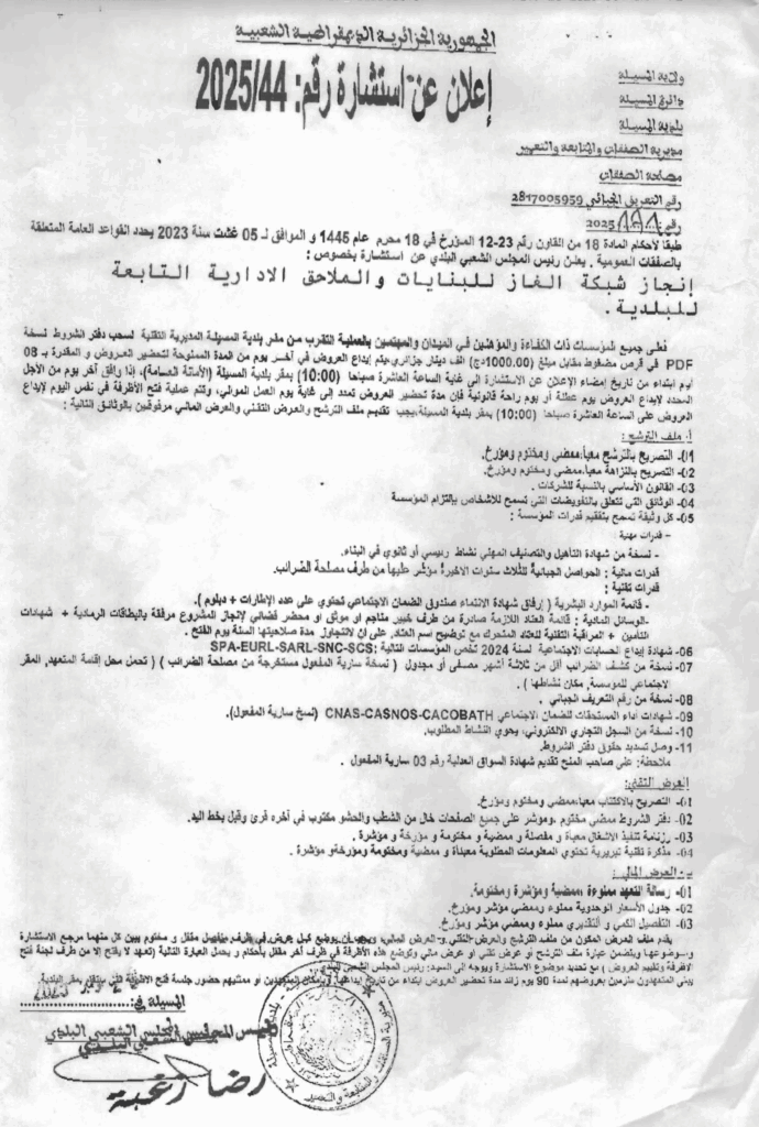 إعلان عن استشارة 2025/44 بلدية المسيلة
