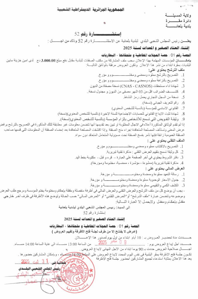 إعلان عن استشارة 2025/52 بلدية بلعايبة