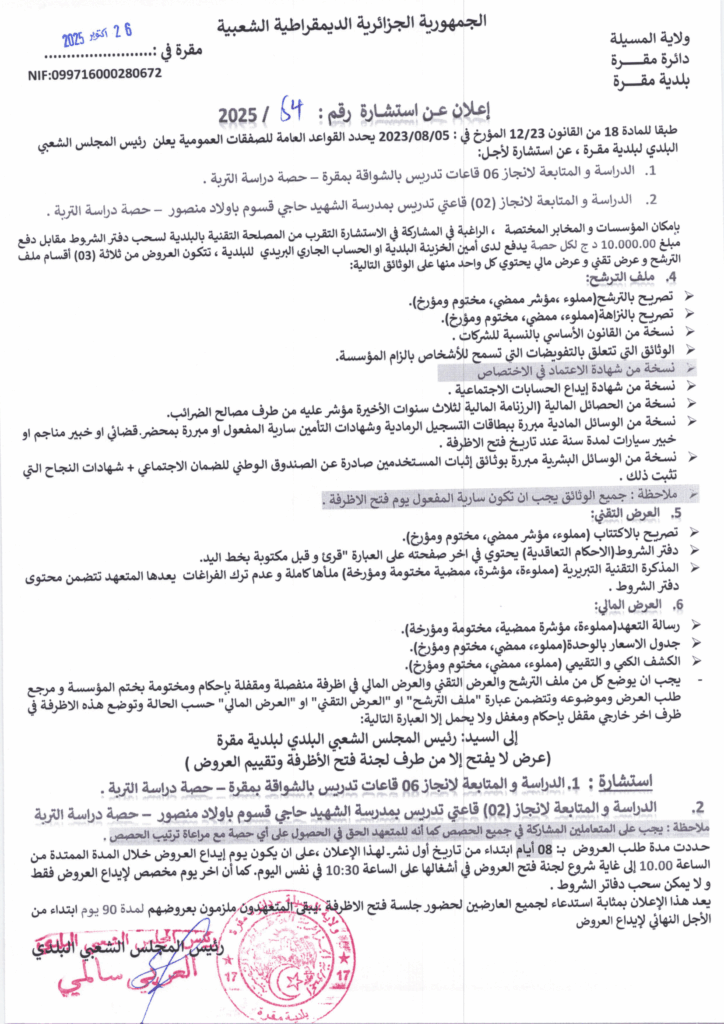 إعلان عن استشارة 2025/54 بلدية مقرة