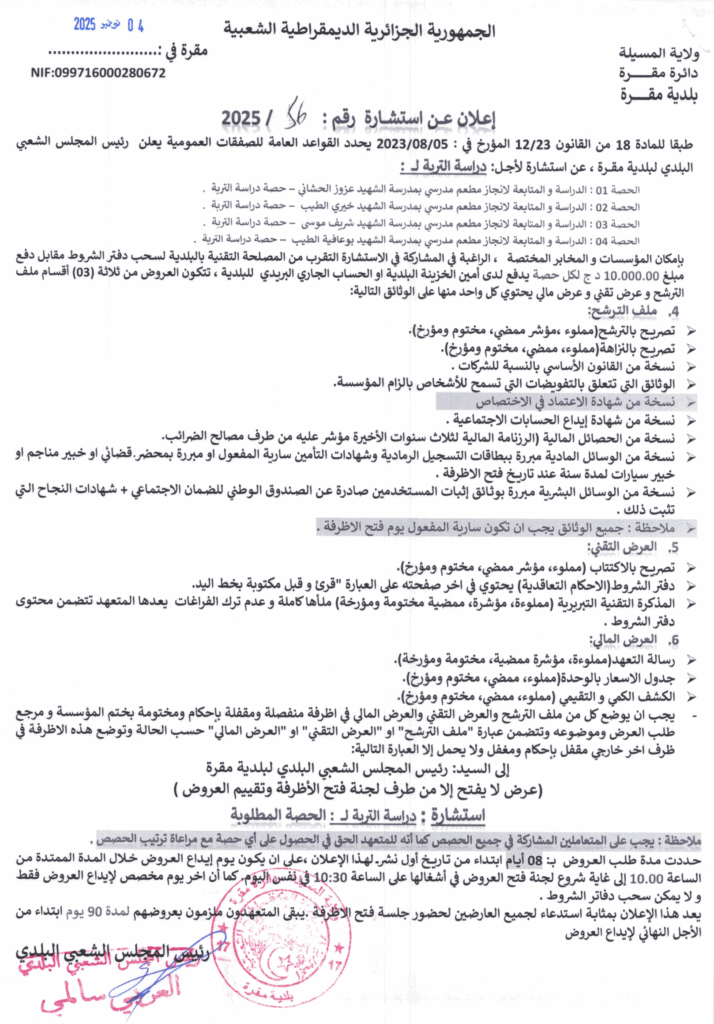إعلان عن استشارة 2025/56 بلدية مقرة