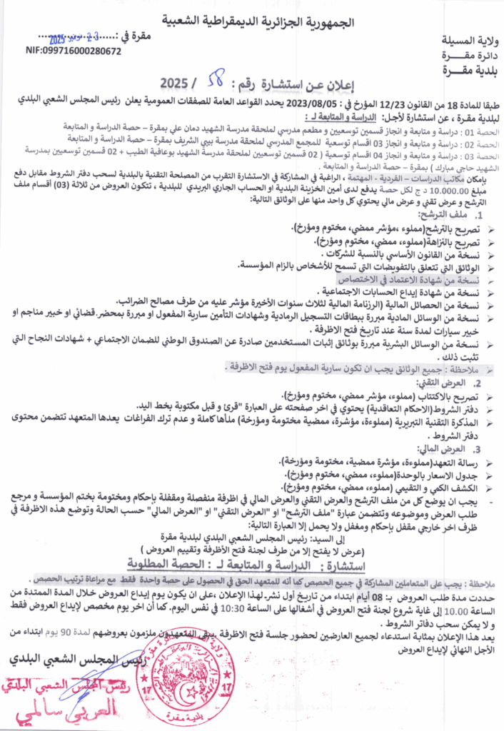 إعلان عن استشارة 2025/58 بلدية مقرة