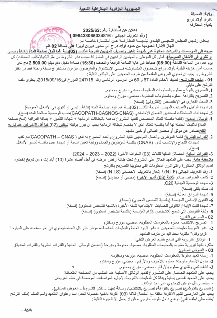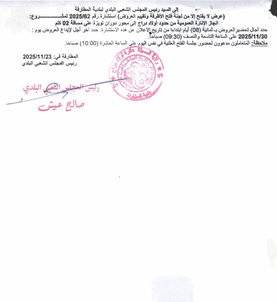 إعلان عن استشارة 2025/62 بلدية المطارفة